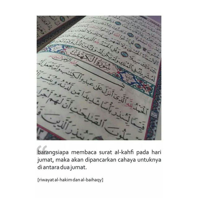 Barangsiapa yang membaca surat al-Kahfi pada hari Jumat, akan diterangi dengan cahaya di antara dua Jumat (H.R anNasaai, al-Baihaqy, al-Hakim dari Abu Said al-Khudriy).